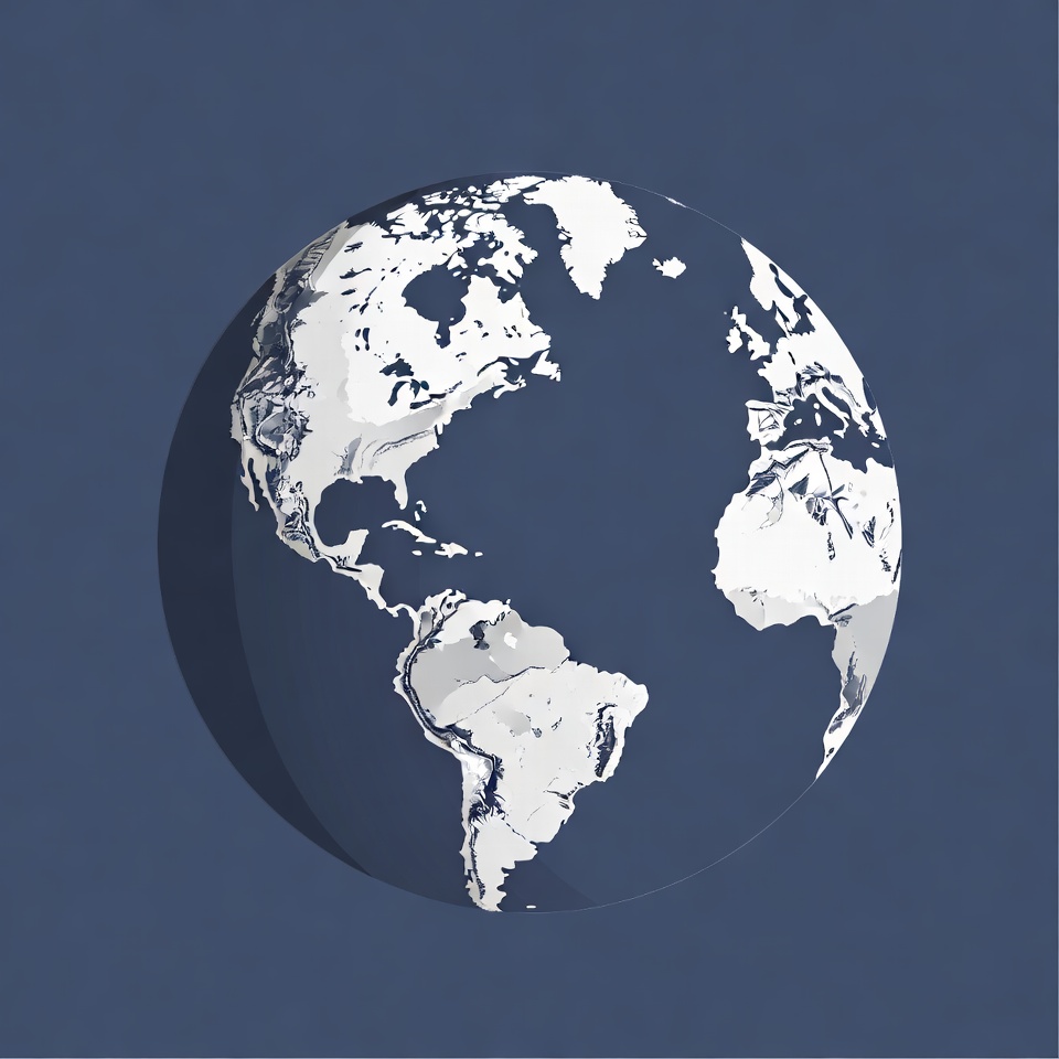 A detailed illustration of the Earth globe features white continents against a deep blue ocean and matching background. North and South America, Europe, Africa, and Asia are prominently visible with subtle shading for depth. The globe is centered and isolated on a solid navy blue backdrop.