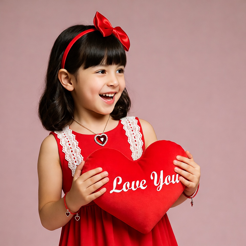 A young Asian girl with black hair and a red bow headband smiles happily while holding a large red heart-shaped pillow. The pillow has 'Love You' written on it in white letters. She wears a red lace-trimmed dress and stands against a pink background.
