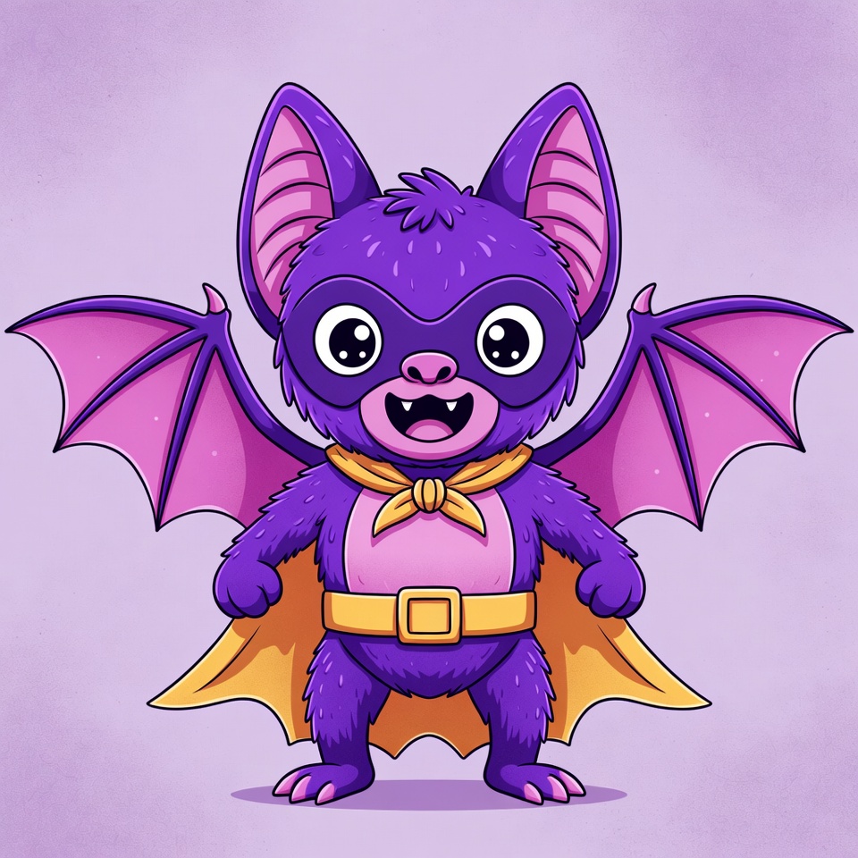 A cartoon purple bat with large expressive eyes stands heroically wearing a yellow cape and belt. Its wings are spread wide, and it has a big smile on its fuzzy face. The illustration is set against a solid purple background.