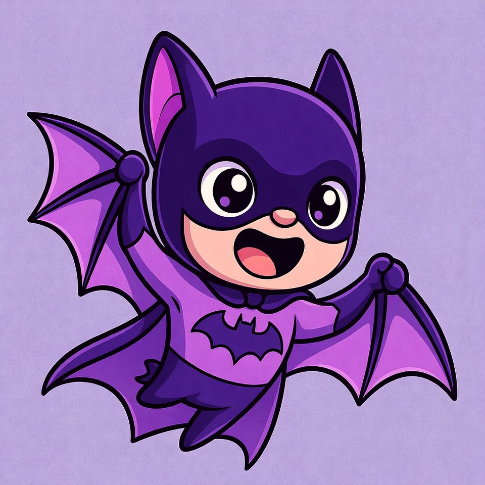 A chibi-style cartoon bat dressed as a purple superhero flies with outstretched wings and arms. It wears a purple mask, suit with bat emblem, and has large expressive eyes and a big smile. The illustration is set against a solid purple background.
