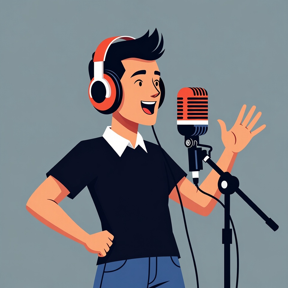 Asian, black shirt, clipart, enthusiastic, gray background, headphones, illustration, jeans, male, man, microphone, music, orange headphones, performer, podcasting, raised hand, short hair, singing, studio, vector art, vocals, white collar, cartoon