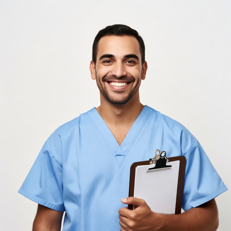 A young man with short dark hair and a warm smile wears blue scrubs and holds a brown clipboard with a white notepad. He stands confidently against a plain white background. His expression is friendly and professional.