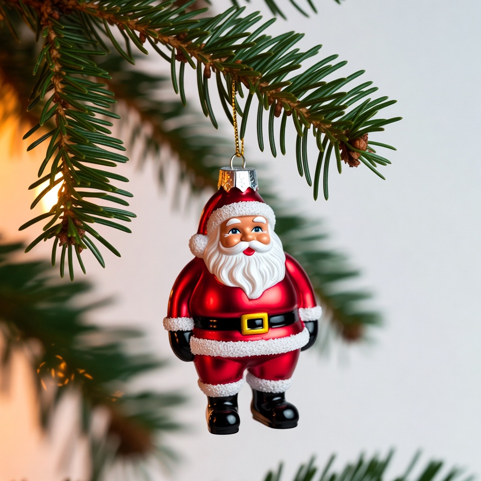 Christmas decoration, Christmas ornament, Christmas tree, Santa figure, evergreen branch, festive ornament, hanging ornament, holiday decoration, holiday figurine, plastic figurine, red suit, smiling Santa, tree branch, white beard, Santa Claus