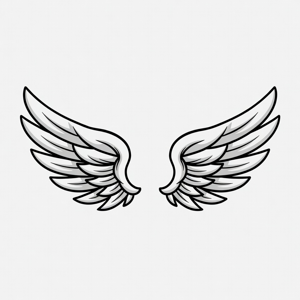 A pair of large white angel wings is illustrated in a simple line art style. The wings feature detailed feathers and are spread open against a transparent background. The design is bold and outlined in black.