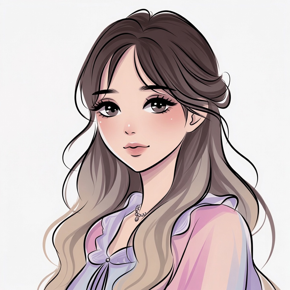 A beautiful anime-style illustration of a young Asian woman with long wavy brown hair transitioning to light ends. She has large expressive eyes, subtle blush on her cheeks, and wears a delicate pink off-shoulder blouse with a necklace. The portrait is set against a plain white background.