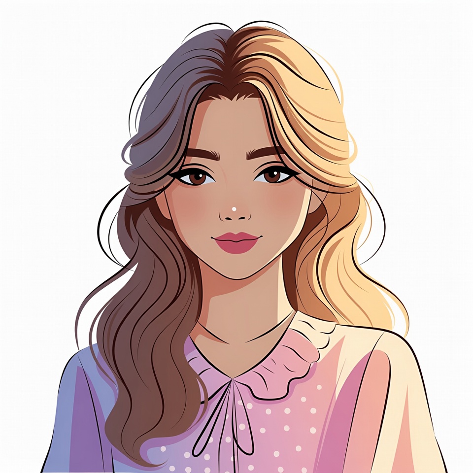 An illustration of a young woman with wavy hair split between brown and blonde sections. She has large expressive eyes, pink lips, and wears a pink collared blouse with polka dots and ruffles. The portrait is on an isolated white background.