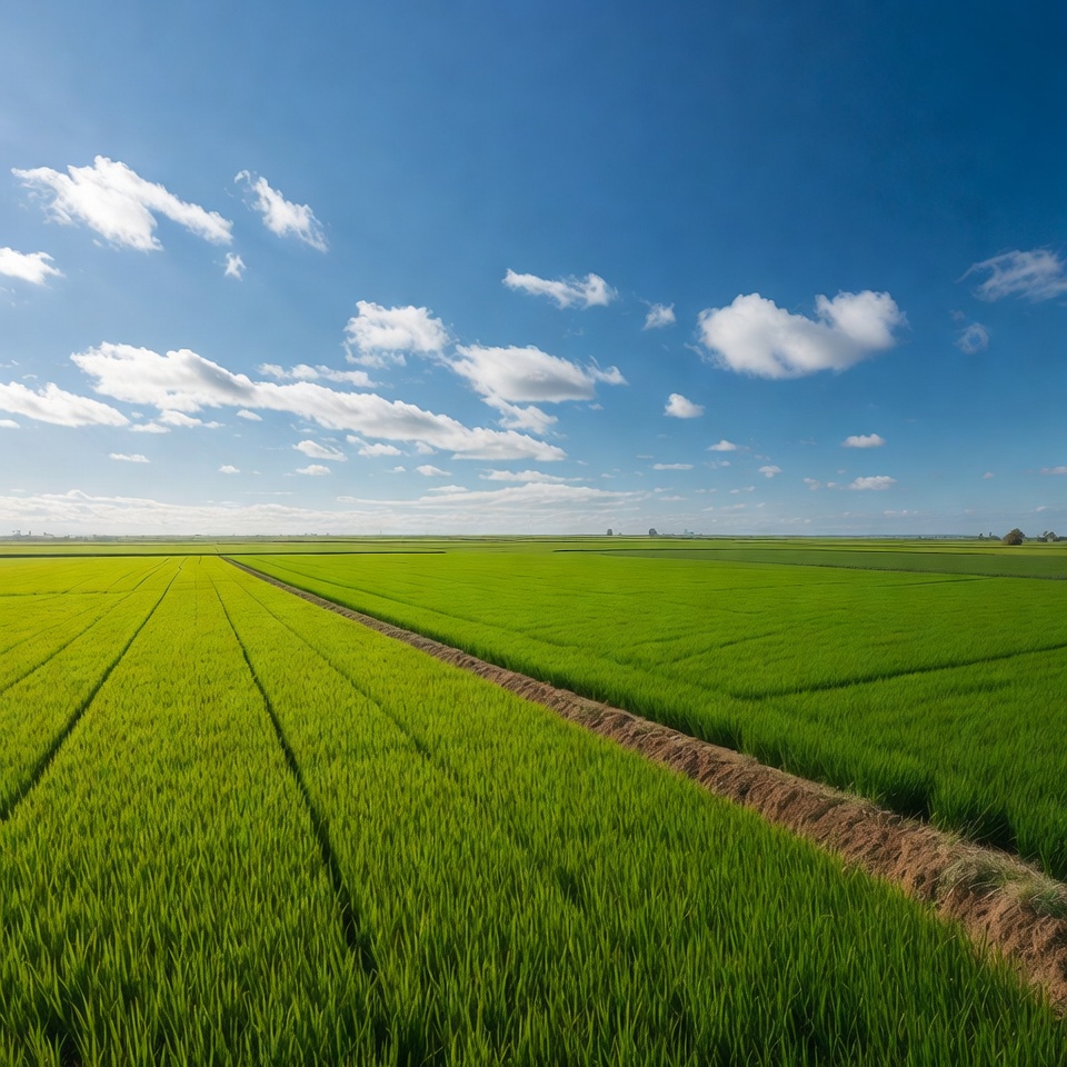 Expansive rice paddy fields stretch across the landscape with neatly aligned rows of vibrant green rice plants. Dirt paths divide the fields under a clear blue sky dotted with white clouds. The scene captures the lush greenery in a wide, open agricultural area.