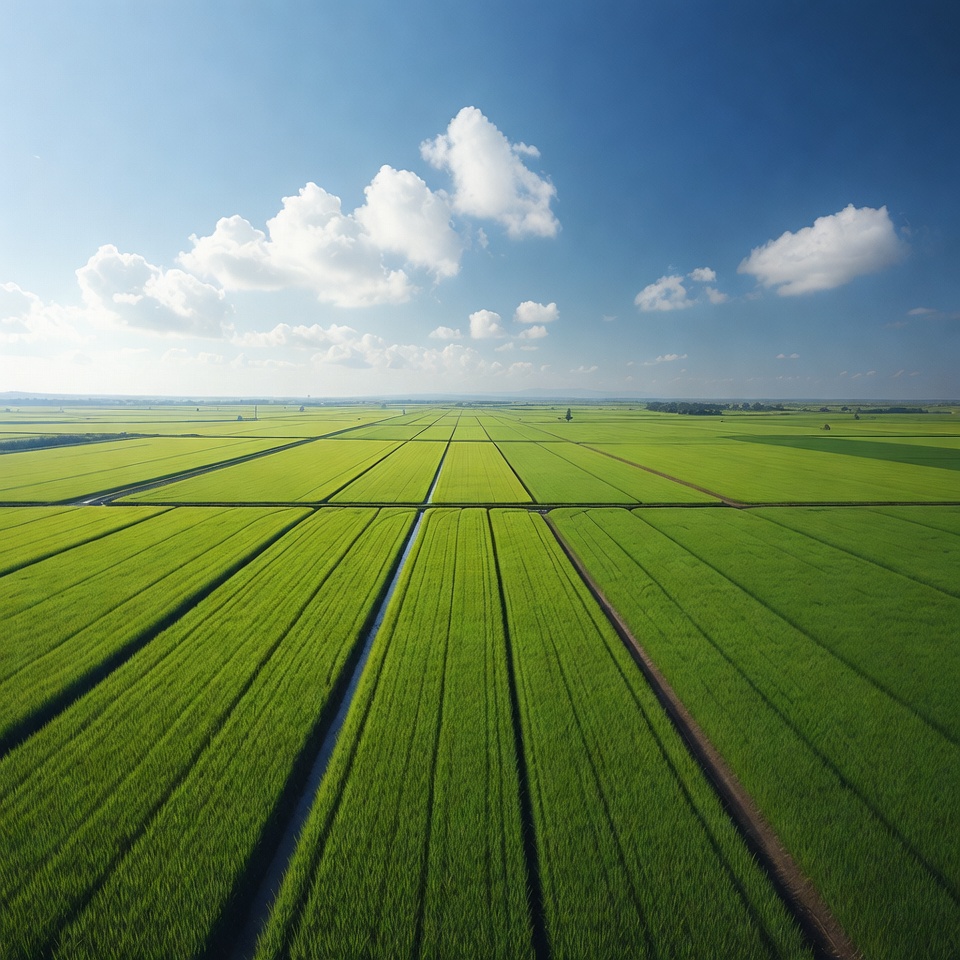 aerial view, agriculture, blue sky, crops, cultivated land, farming, farmland, fields, green fields, grid pattern, harvest, landscape, lush green, nature, outdoor, paddy fields, panorama, rice paddies, rural, scenery, terrain, vegetation, waterways, white clouds, rice fields