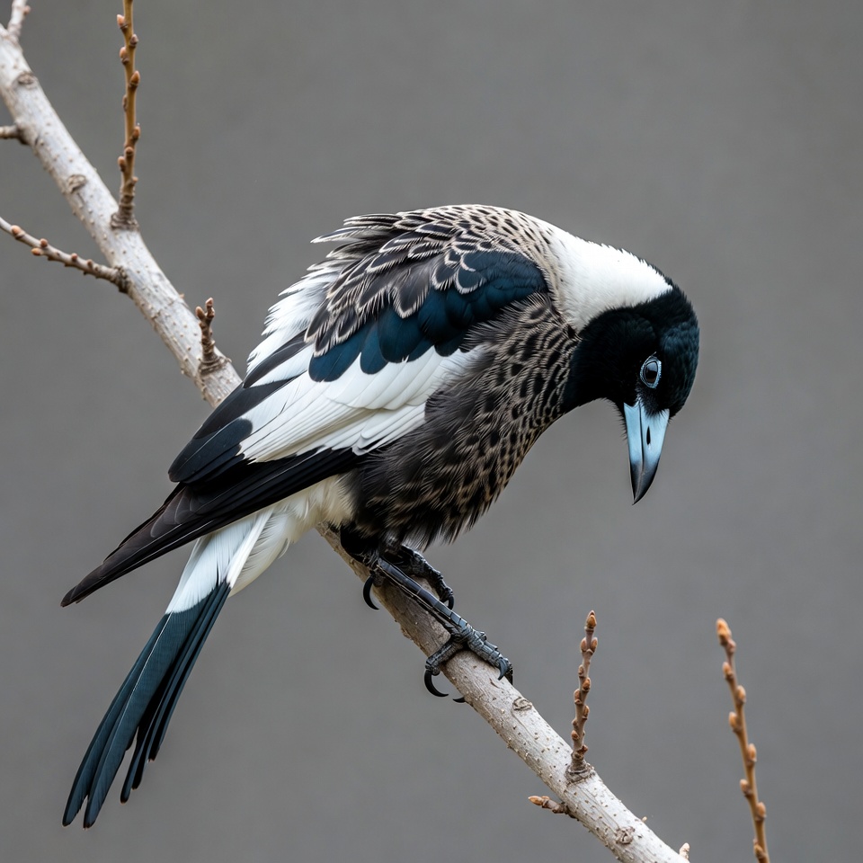 A magpie with black, white, and gray feathers perches on a thin branch with sparse buds. Its wings are slightly spread, showcasing detailed plumage and a blue-black sheen. The bird faces left against a neutral gray background.