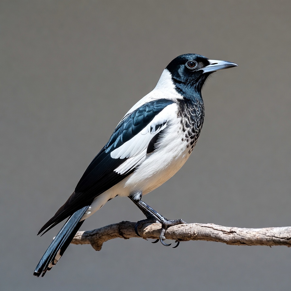 A black and white magpie with glossy black head, white underparts, and blue wing flashes perches on a thin wooden branch. Its long tail feathers hang down gracefully. The bird stands against a plain gray background.