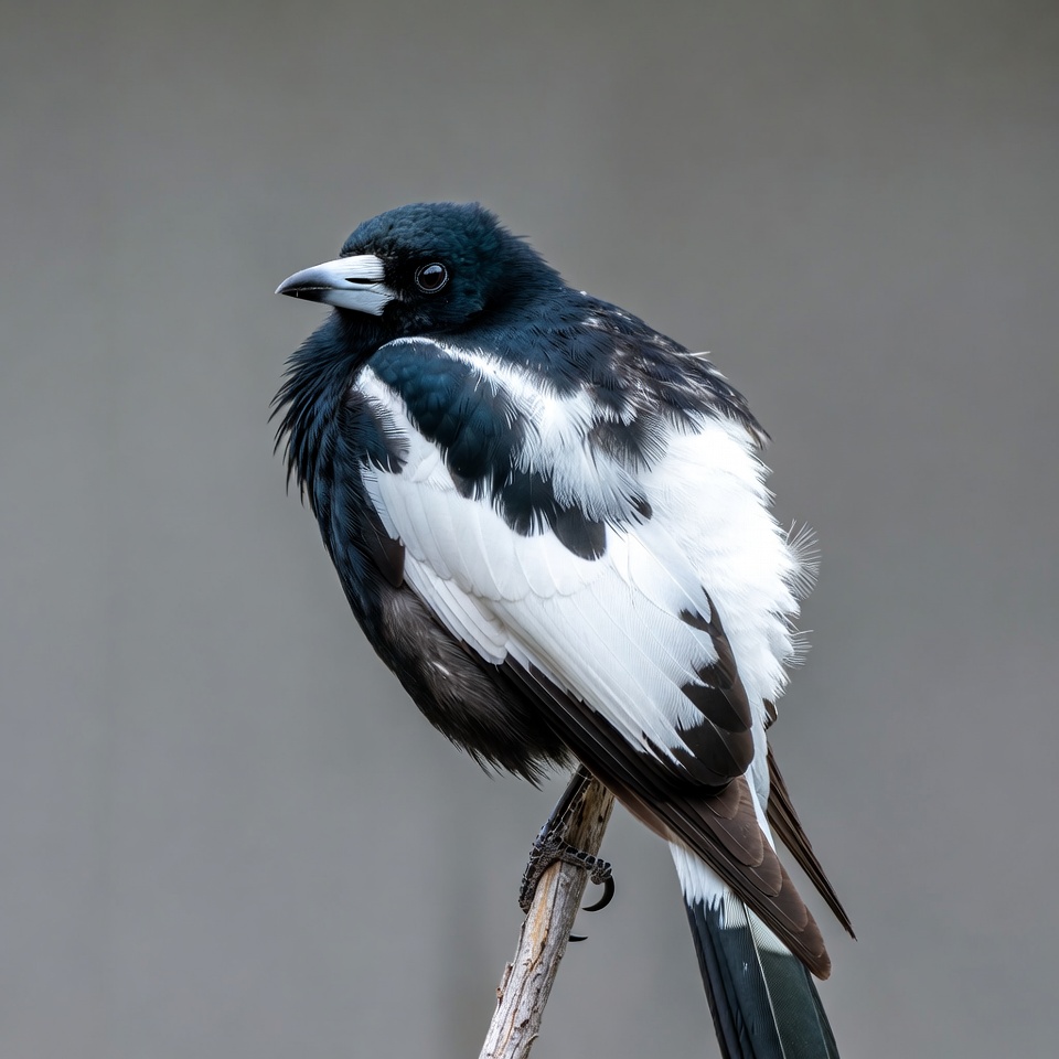 A black-billed magpie with glossy black feathers and prominent white wing patches perches on a thin wooden branch. Its head is turned slightly, showing a sharp white beak and dark eye. The bird's fluffy feathers and tail feathers fan out against a plain gray background.