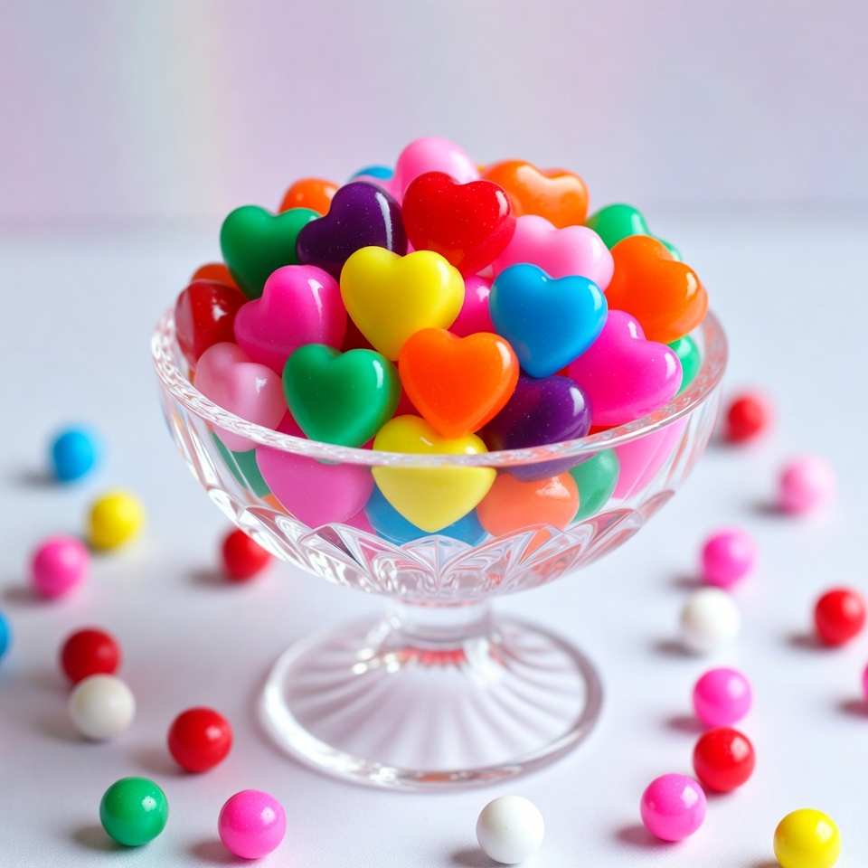 Colorful Heart-Shaped Candies in Glass Bowl