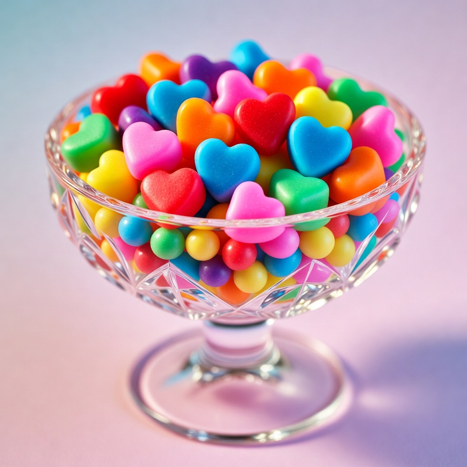 blue hearts, candy bowl, candy pile, colorful hearts, faceted bowl, glass bowl, green hearts, gummy hearts, heart candies, orange hearts, pink background, pink hearts, purple hearts, rainbow hearts, red hearts, round candies, shiny candies, sweets, valentine candy, yellow hearts, candy hearts