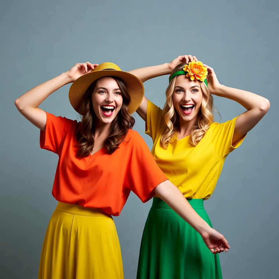 Brazilian flag colors, Carnival style, White, arms raised, blonde hair, brown hair, curly hair, dancing, female, flower headband, friends, green headband, green skirt, joyful pose, laughing, orange shirt, smiling, studio background, two women, vibrant colors, wide-brim hat, yellow flower, yellow hat, yellow shirt, yellow skirt, women