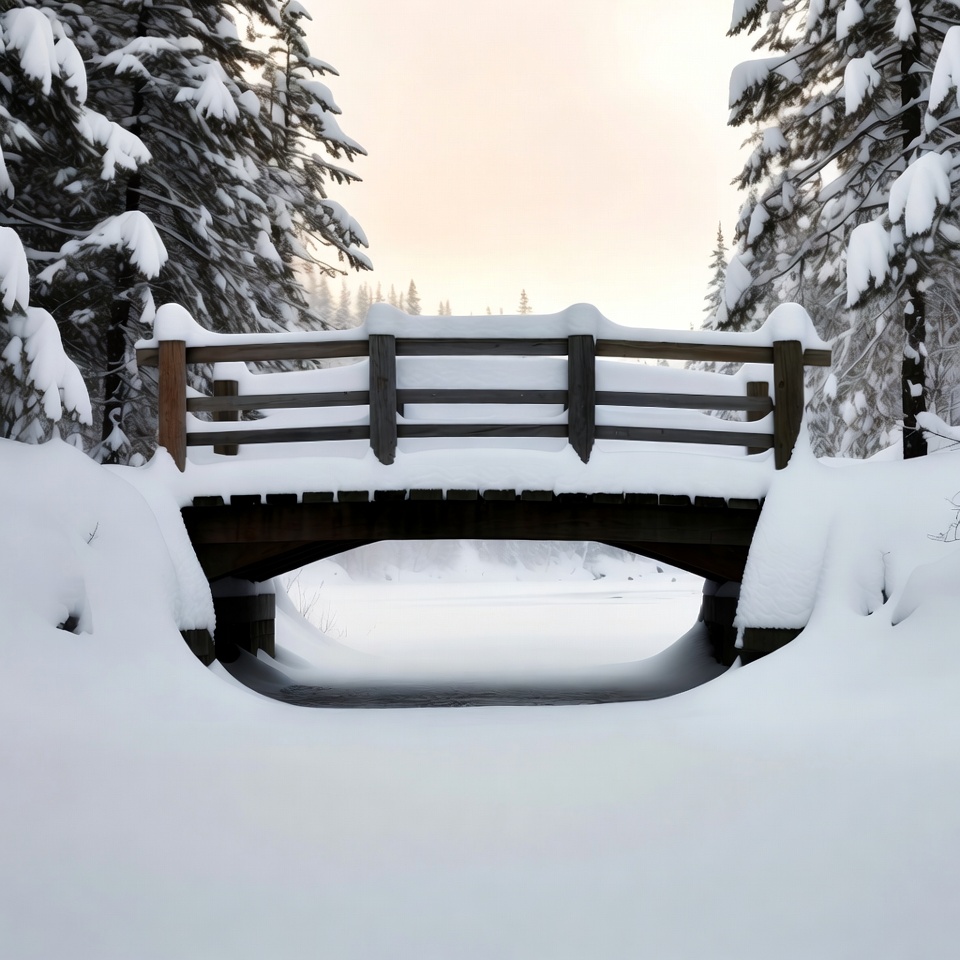 A wooden bridge arches over a snowy path in a dense forest of snow-covered evergreen trees. The bridge features sturdy railings blanketed in thick snow, with a soft sunset glow illuminating the winter scene. Fresh snow blankets the ground and trees surrounding the isolated bridge.