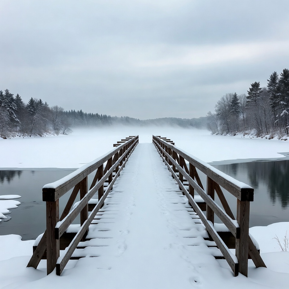A wooden footbridge spans a partially frozen river covered in snow. Dense pine trees line both snowy banks under a cloudy sky. Fog rises from the water, creating a misty atmosphere around the bridge.