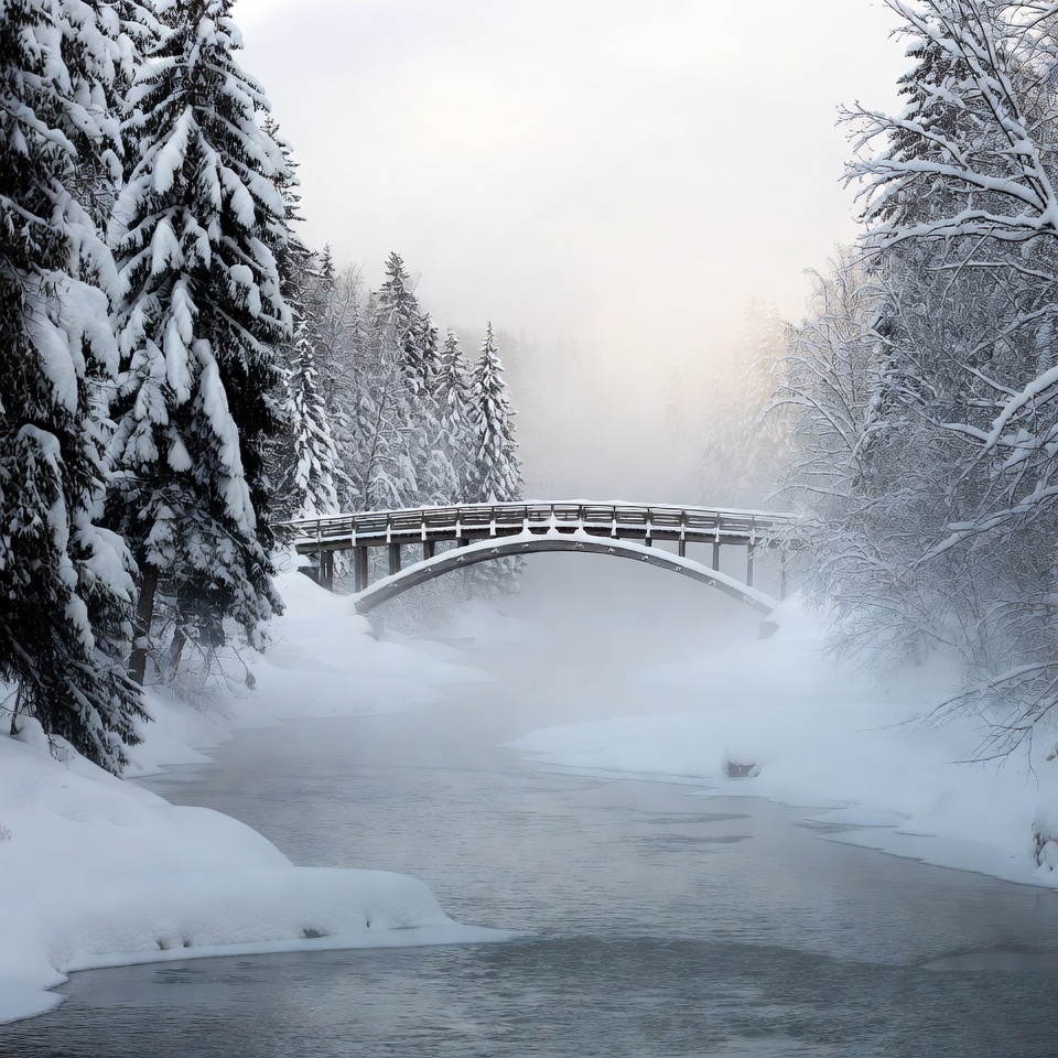 arch bridge, arched bridge, cold weather, evergreen trees, foggy bridge, forest bridge, frozen river, ice river, mist, nature, outdoors, pine trees, river bridge, snow banks, snow covered trees, snowy forest, white landscape, winter landscape, winter scene, wooden bridge, snowy bridge