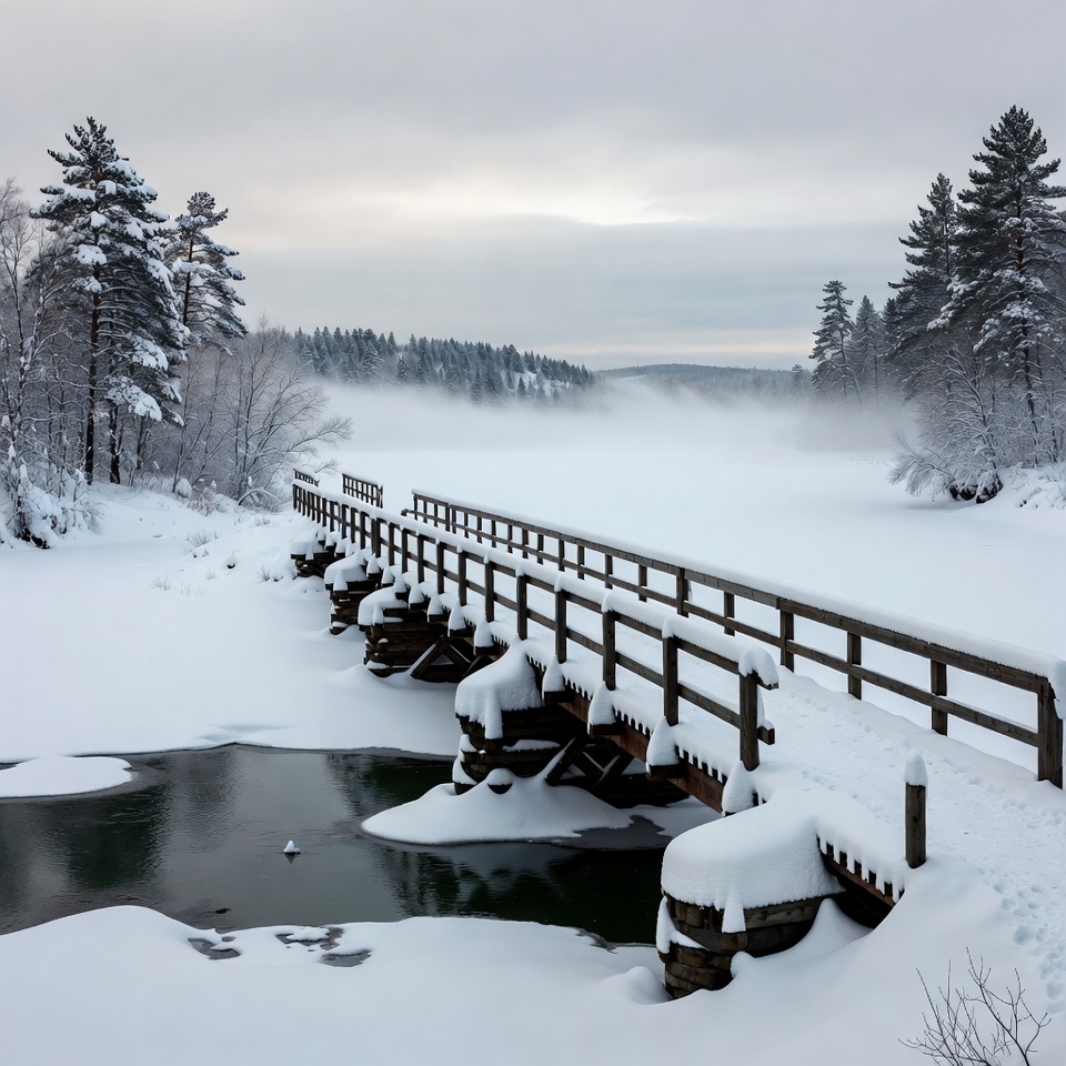 A wooden bridge covered in snow spans a frozen river surrounded by dense pine trees. Mist rises from patches of open water beneath the bridge, with gray skies overhead. Snow blankets the landscape and trees in a serene winter scene.