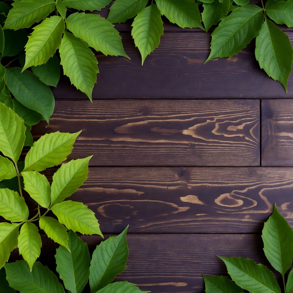 Lush green leaves with serrated edges frame a dark wooden surface. The wood features prominent grain patterns and planks arranged horizontally. The leaves are vibrant and clustered around the edges, creating a natural border.