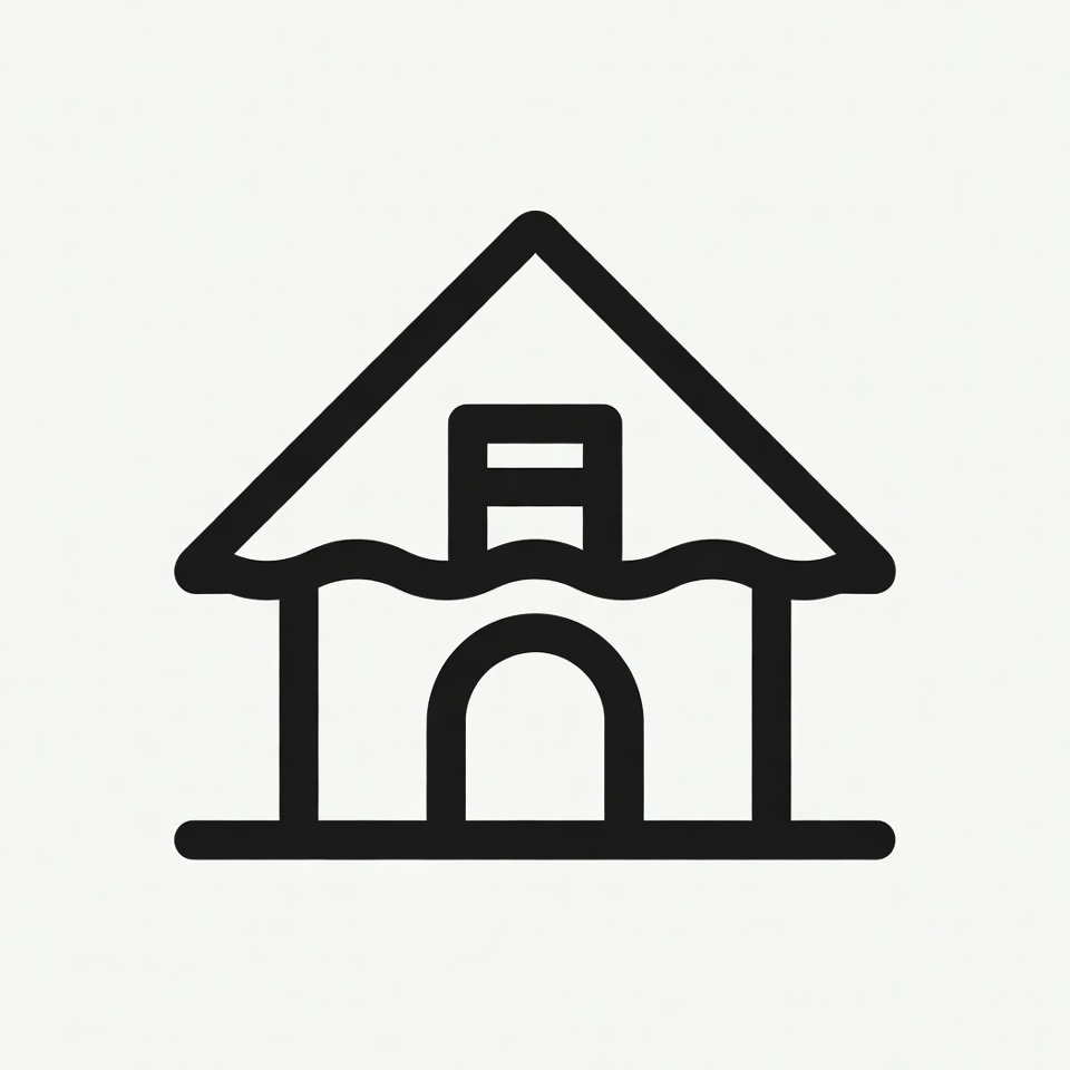 A simple black line art illustration depicts a house partially submerged in wavy water. The house features a peaked roof, a small rectangular window, and an arched door on the front. It is presented on an isolated white background.