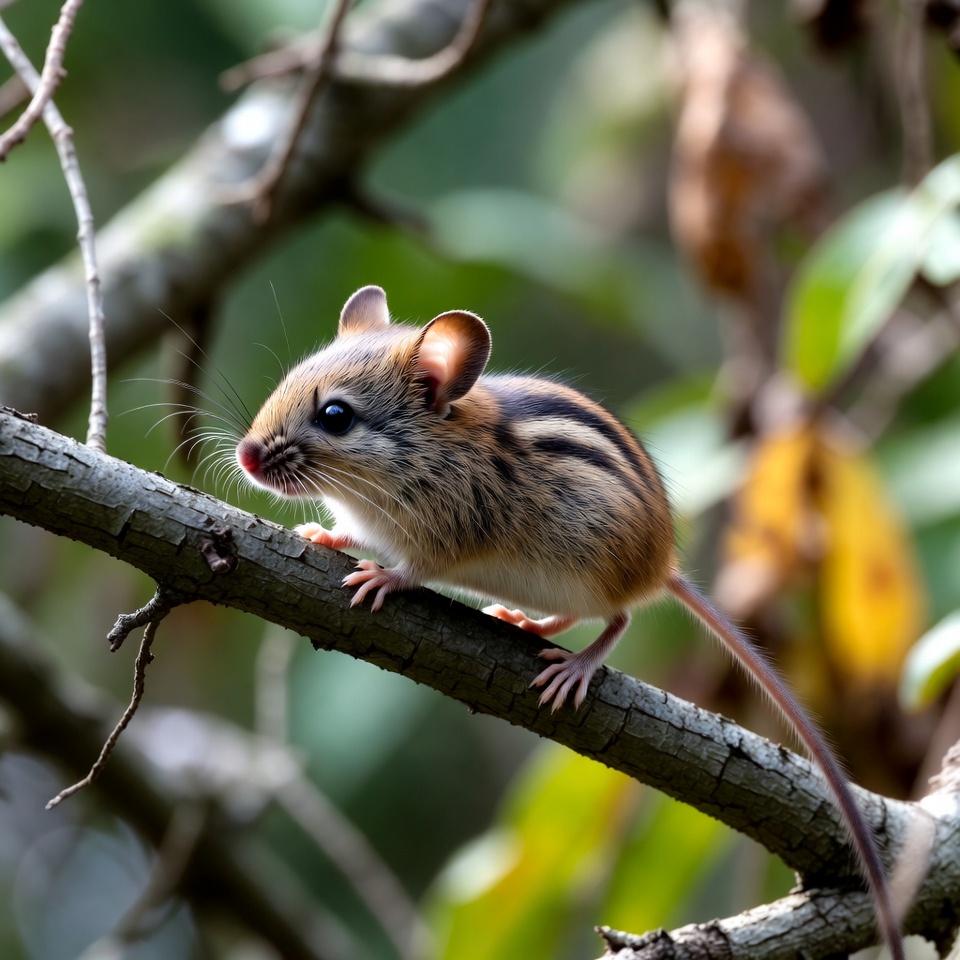 A small striped chipmunk with brown fur and distinctive black stripes sits on a thin tree branch. It has large dark eyes, pink nose, and whiskers, surrounded by green leaves and branches. The chipmunk grips the branch with its tiny paws and long tail.