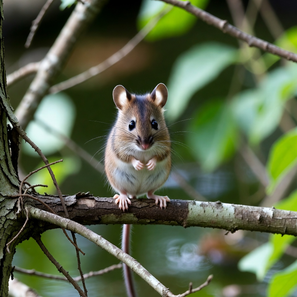 A small brown field mouse with large dark eyes and pink ears stands on a mossy tree branch. It holds its tiny front paws together and gazes forward. Lush green leaves and branches frame the mouse in a natural forest setting.