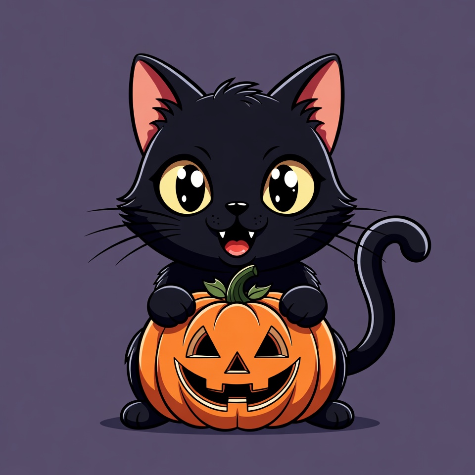 A cute cartoon black cat with large yellow eyes and a big smile holds a carved orange pumpkin. The cat sits on a purple background with its tail curled around. The illustration features bold outlines and vibrant Halloween colors.