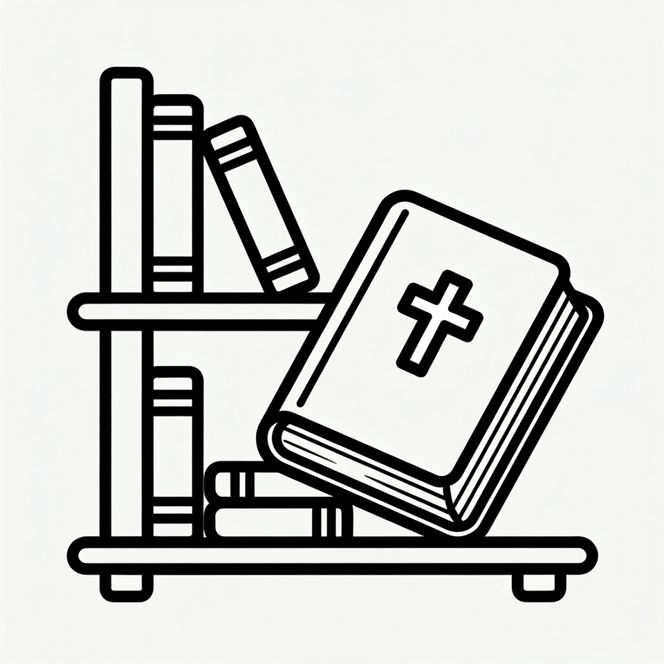 A black line art illustration depicts a bookshelf with multiple books on two shelves. A large open Bible with a prominent cross symbol rests prominently on the lower shelf. The design features clean outlines on an isolated white background.