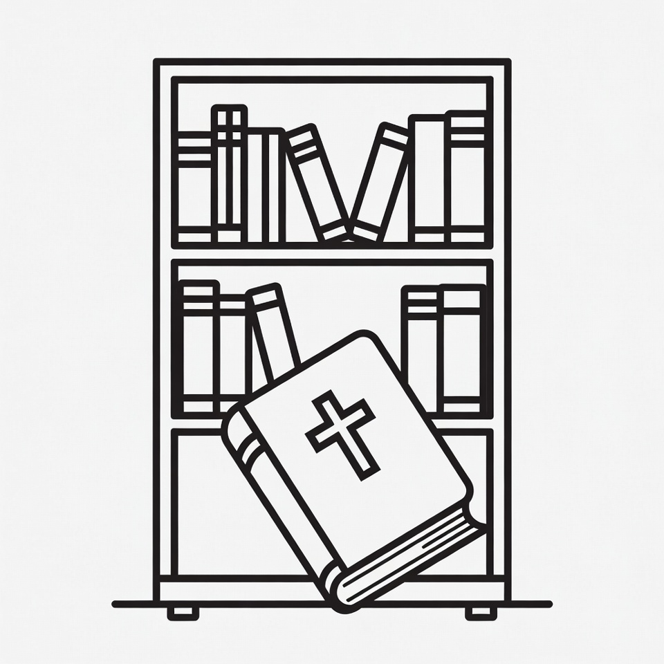 A line art illustration depicts a tall bookshelf filled with multiple books on three shelves. A large open Bible with a prominent cross symbol rests on the bottom shelf. The entire image is rendered in black outlines on a white background.