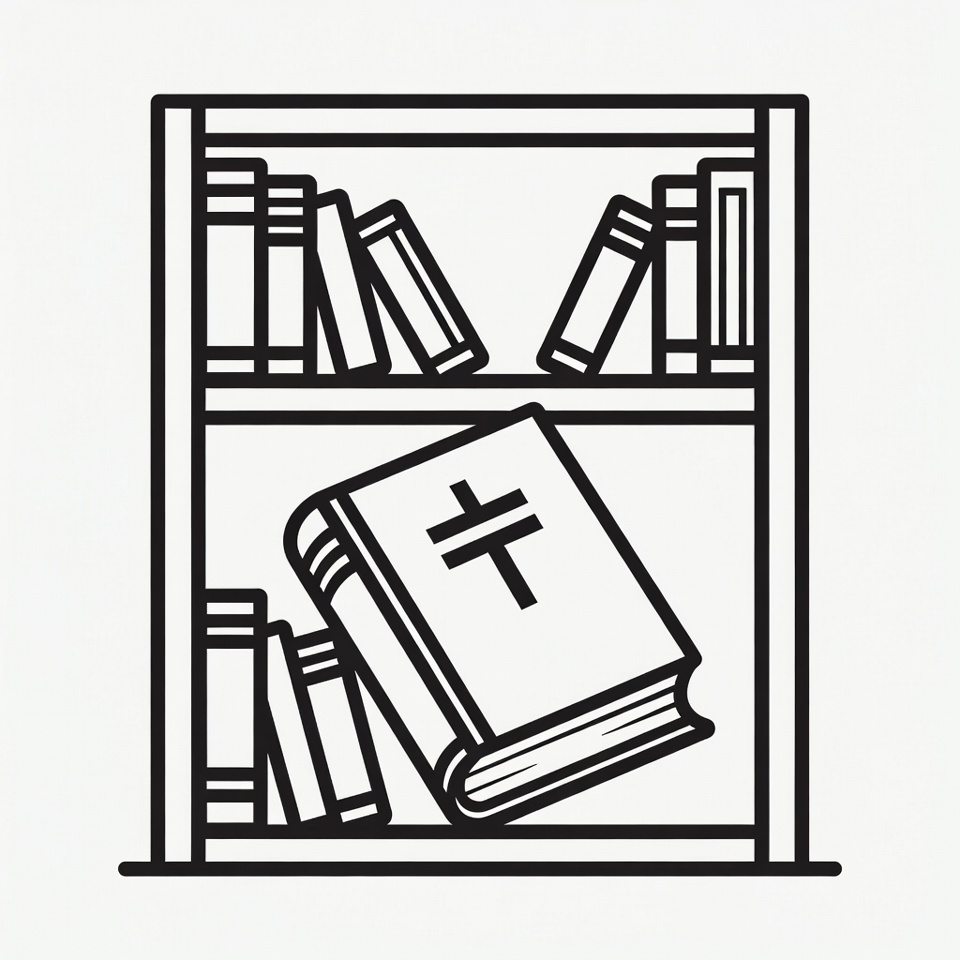 A line art illustration depicts a wooden bookshelf filled with multiple books on two shelves. A prominent open Bible with a Christian cross symbol lies diagonally across the bottom shelf. The entire scene is outlined in black on a white background.