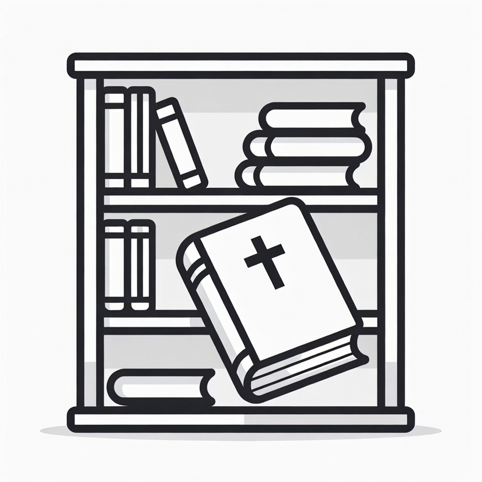 A simple line art illustration depicts a wooden bookshelf filled with multiple books. An open Bible with a prominent cross symbol stands out prominently on the middle shelf. The design features clean black outlines on a white background.