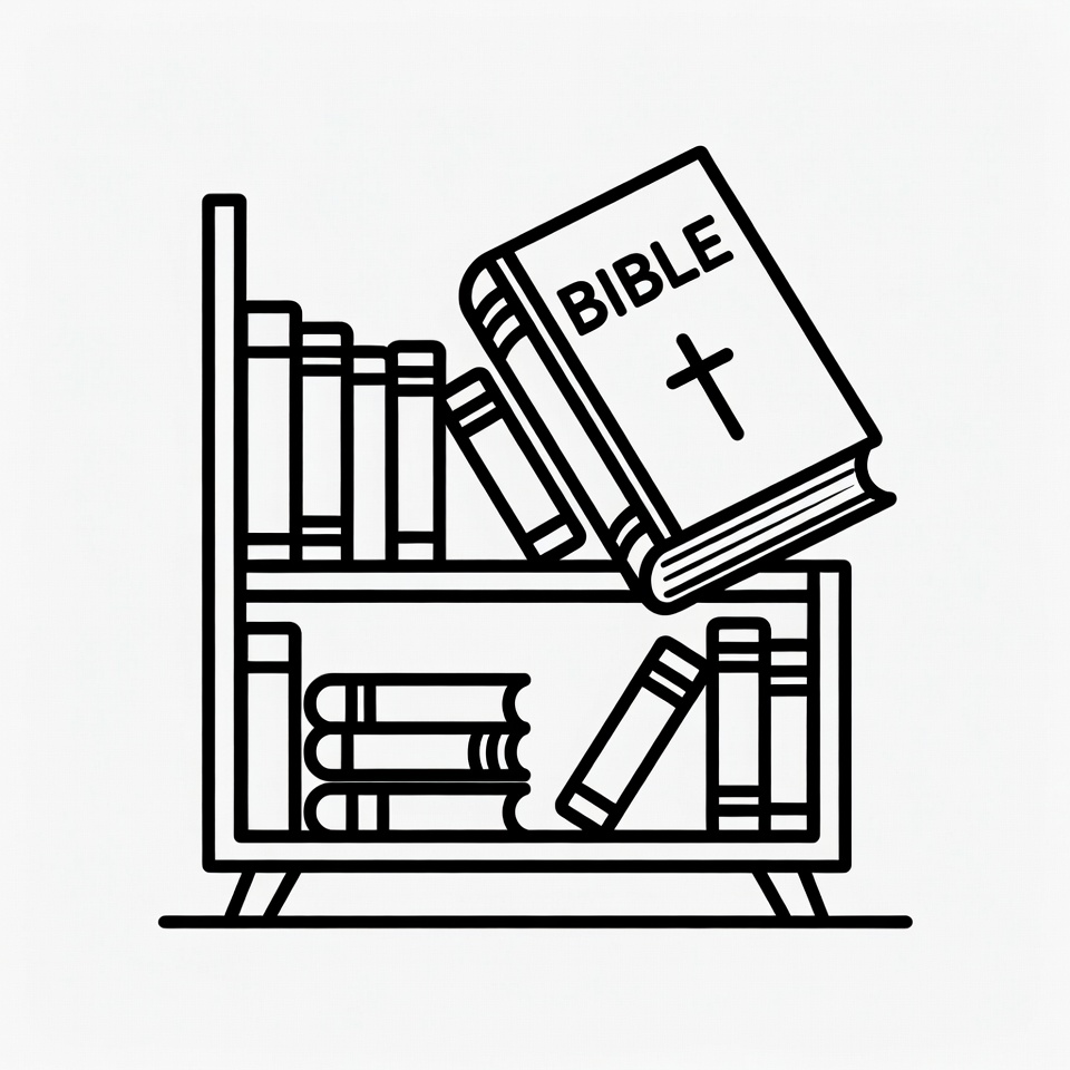 A black line art illustration depicts a wooden bookshelf with multiple books. A large open Bible with a prominent cross symbol leans prominently against the upper shelf. The design features clean outlines on an isolated white background.