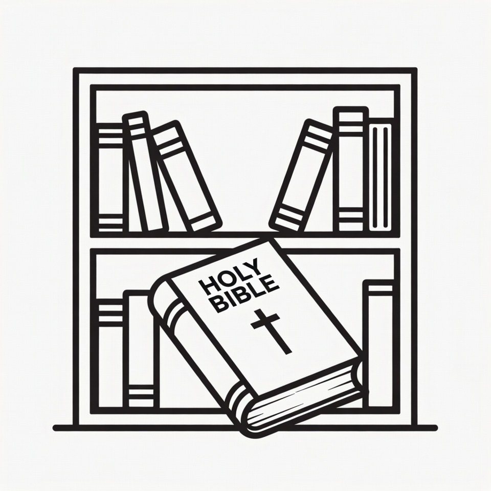 A black line art illustration depicts a bookshelf filled with books. A large open Holy Bible with a cross symbol protrudes from the middle shelf. The design features clean outlines on an isolated white background.