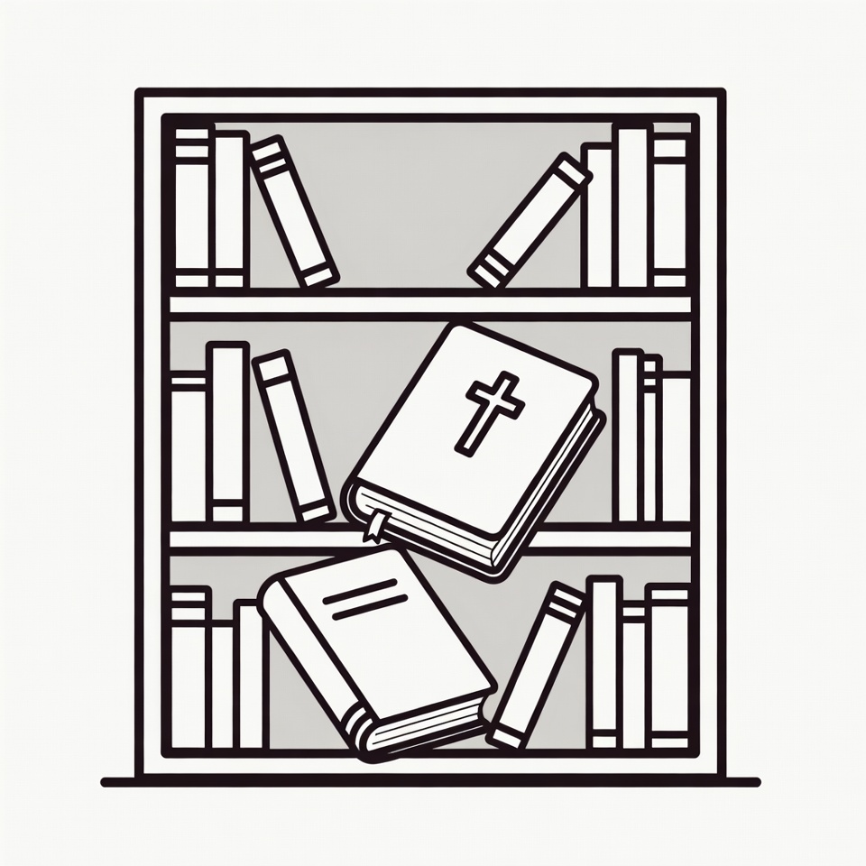A line art illustration depicts a wooden bookshelf filled with books. An open Bible with a prominent cross symbol is falling from the middle shelf among other books. Additional books are tilted and scattered on the lower shelf.