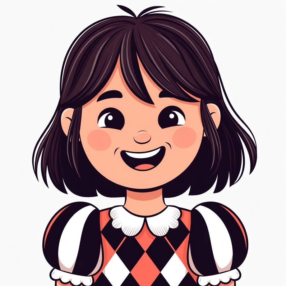 Asian, big eyes, brown hair, cartoon, clipart, dark hair, diamond pattern, female, happy face, harlequin costume, harlequin outfit, illustration, isolated background, puffed sleeves, rosy cheeks, smiling girl, white collar, girl