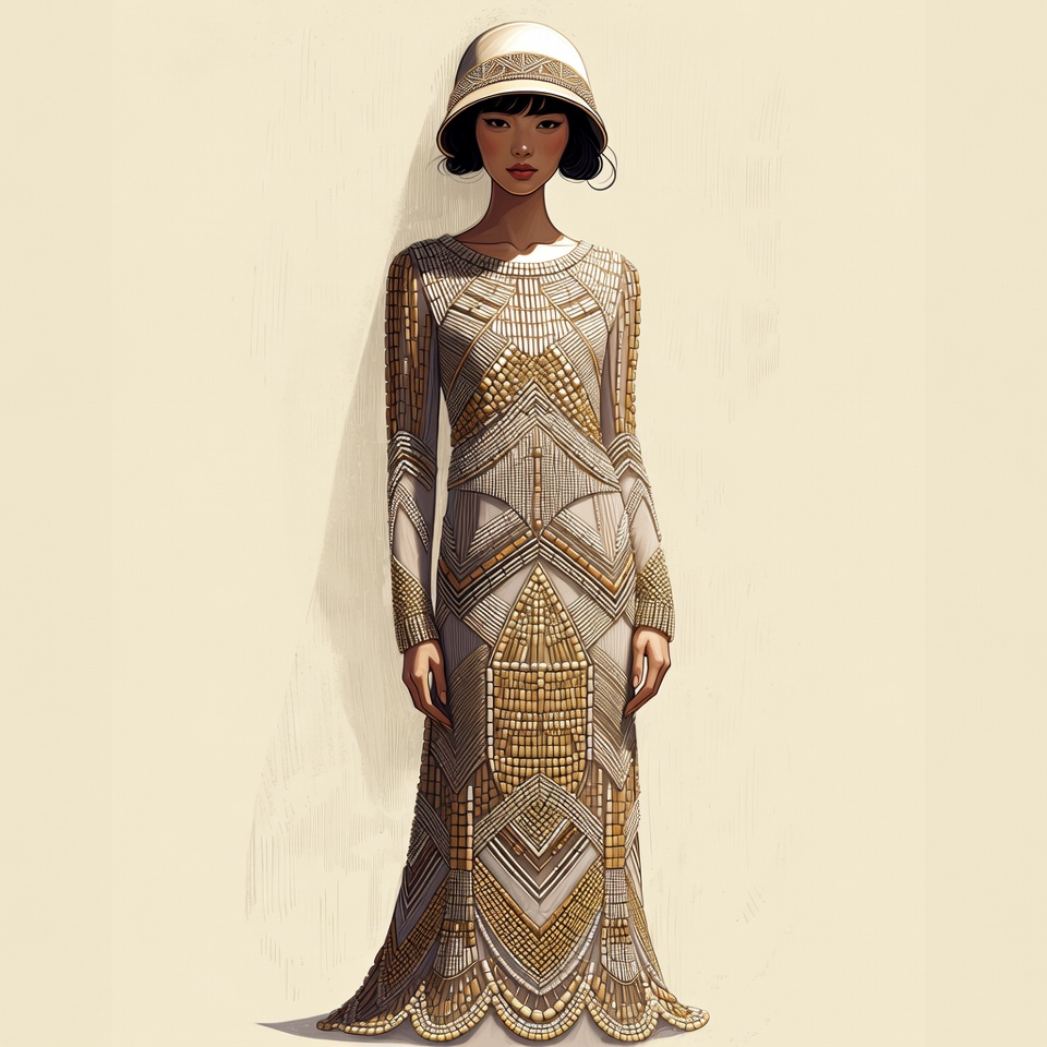 An Asian woman with short black bob hair and bangs wears a cream-colored cloche hat. She stands in a beaded art deco gown with intricate gold geometric patterns and long sleeves. The illustration is set against a plain beige background.
