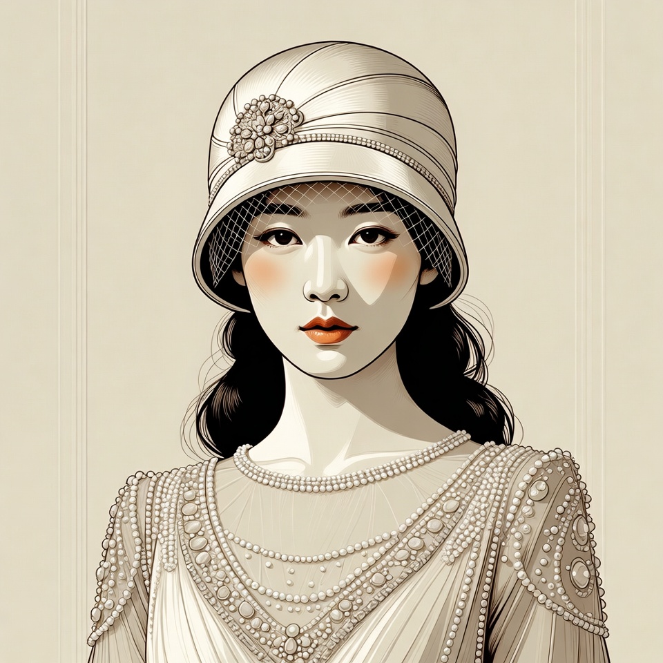 1920s fashion, Art Deco, Asian, art, beaded dress, beaded gown, beige background, black hair, blush cheeks, cloche hat, digital illustration, elegant woman, flapper style, flower hat, illustration, isolated background, makeup, pearl necklace, portrait, red lips, retro fashion, sheer fabric, veil, vintage hat, wavy hair, woman
