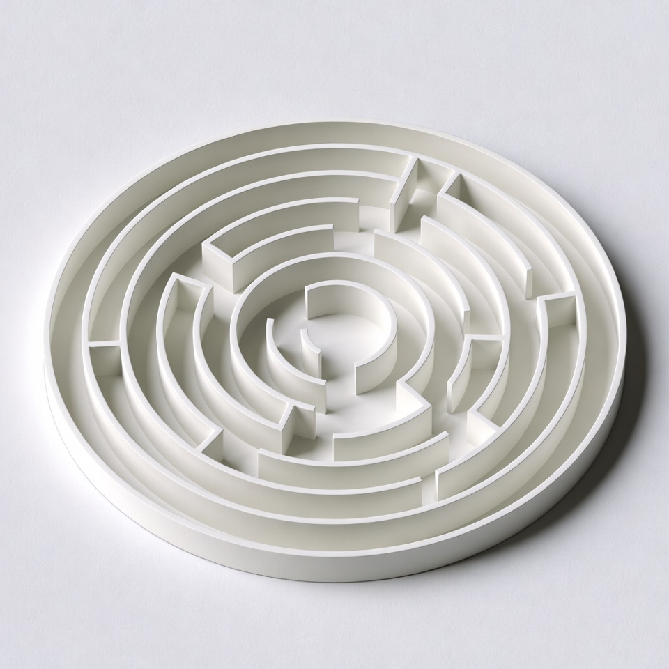 A three-dimensional white maze forms a circular labyrinth with intricate walls and pathways. The design features multiple concentric rings and dividing barriers viewed from above. It is isolated on a plain white background.
