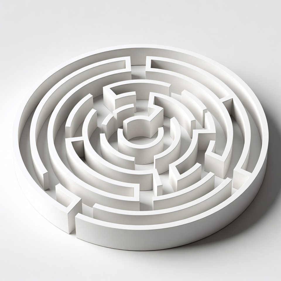 A three-dimensional white maze with a circular design is rendered on a plain background. The maze features intricate walls forming paths that spiral inward to a central opening. It is viewed from a top-down angle with subtle shadows for depth.