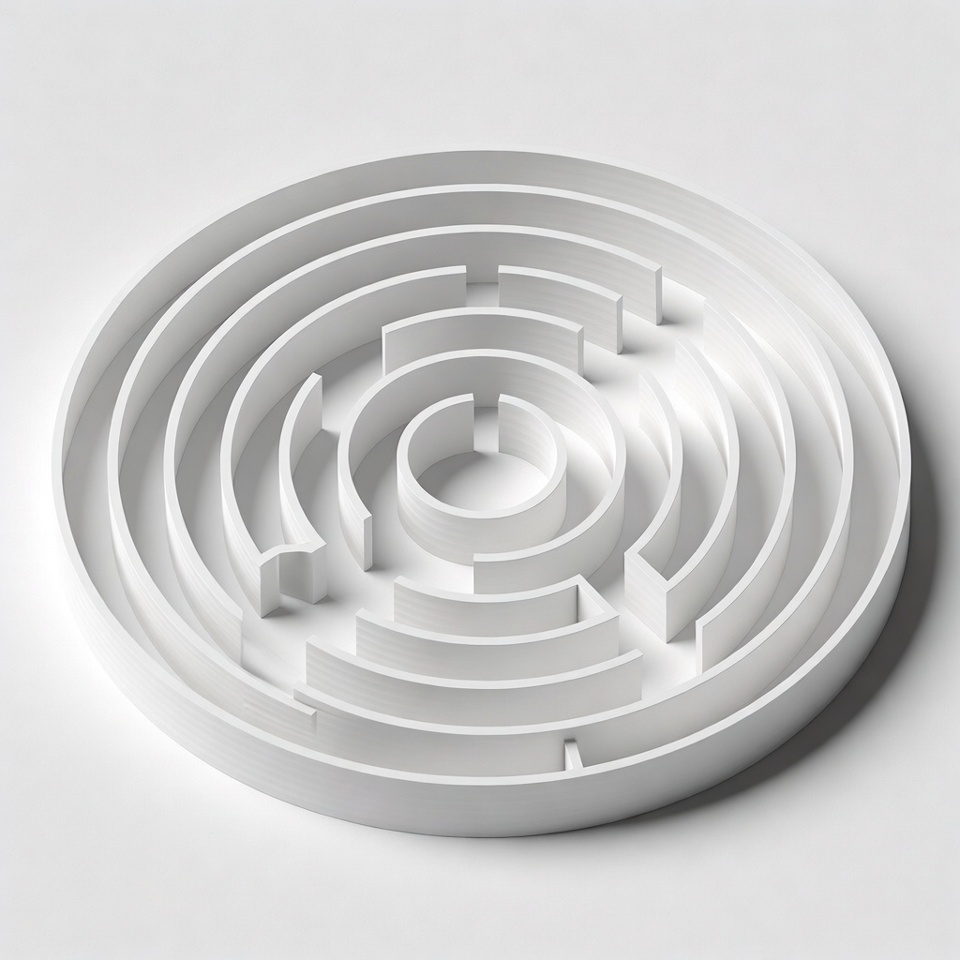A three-dimensional white maze forms a perfect circle viewed from above at a slight angle. The intricate labyrinth features concentric walls with a clear path leading to the center. It is rendered in a clean, minimalist style on a plain white background.
