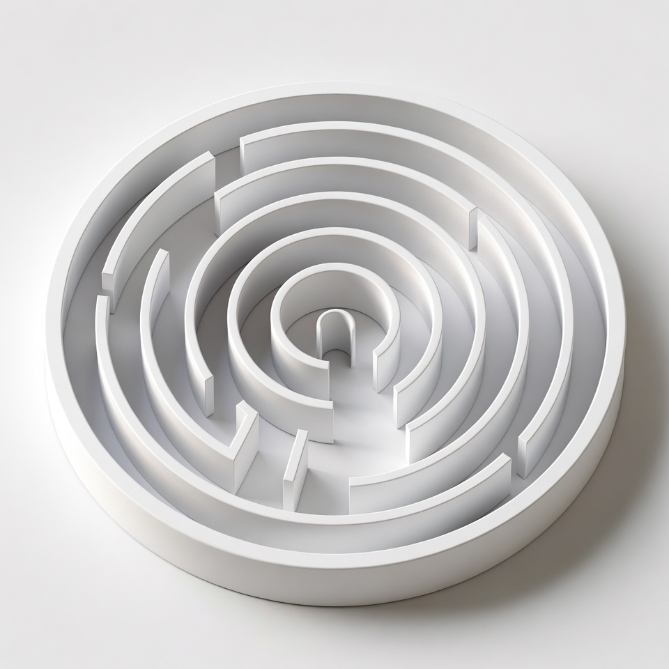 3D maze, 3D render, circular maze, complexity, isolated background, labyrinth, maze design, paths, puzzle, round labyrinth, spiral maze, top view, walls, white maze, white puzzle, maze