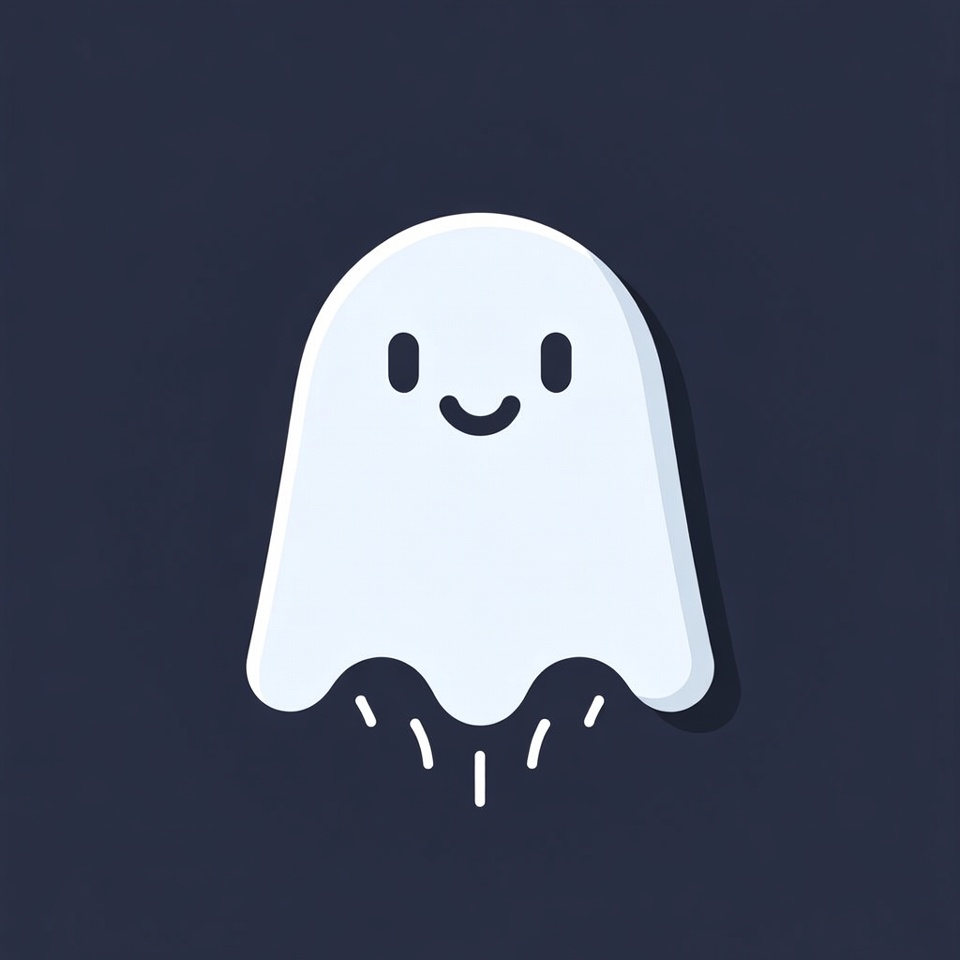 A simple white cartoon ghost with a happy smile and big eyes floats against a dark blue background. It has a rounded body with wavy bottom edges and small trailing lines beneath. The illustration features clean lines and a kawaii style.