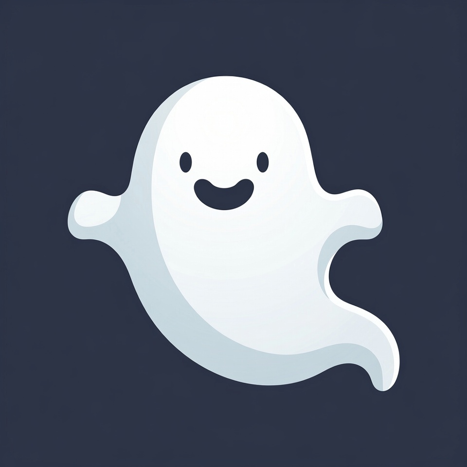 A white cartoon ghost with happy eyes and a wide smile floats against a dark background. Its arms are outstretched and it has a wispy tail. The illustration features smooth, rounded shapes in a playful style.