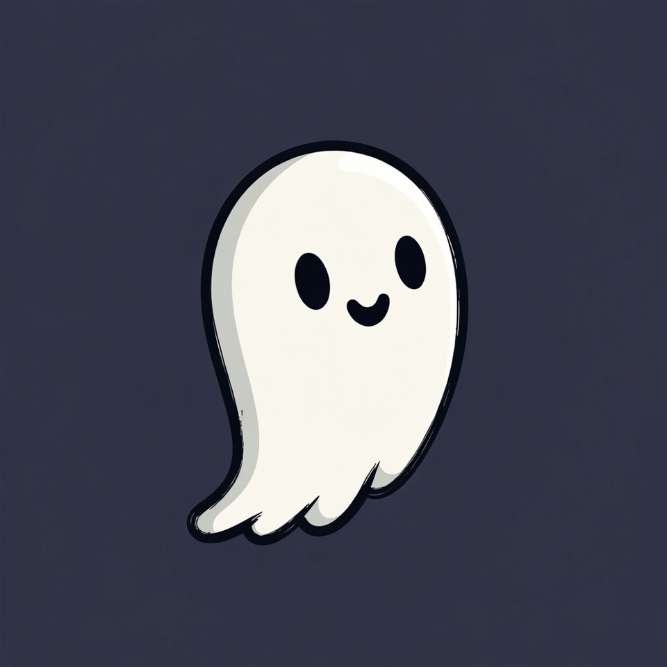 A white cartoon ghost with large black eyes and a smiling mouth floats against a dark blue background. It has a simple, rounded shape with wavy bottom edges and bold black outlines. The illustration features a friendly, kawaii-style design.