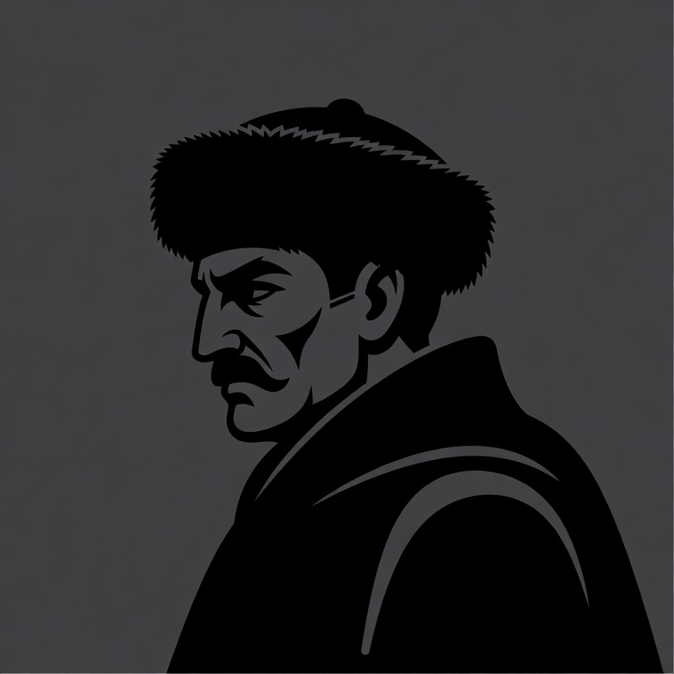 A black silhouette illustration of a man in profile view against a gray background. He wears a traditional fur-trimmed hat and a collared coat. His face features a prominent mustache and a stern expression.