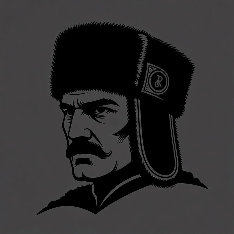 A black silhouette illustration of a stern man with a thick mustache wearing a traditional fur ushanka hat. The hat features ornate detailing and a circular emblem on the side. The design is set against a solid gray background.