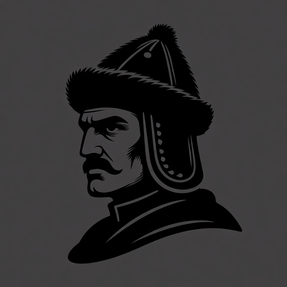 A black silhouette illustration of a stern Cossack man in profile view against a gray background. He wears a traditional fur-trimmed hat with a plume and ornate military uniform. His mustache and intense expression are prominently featured.