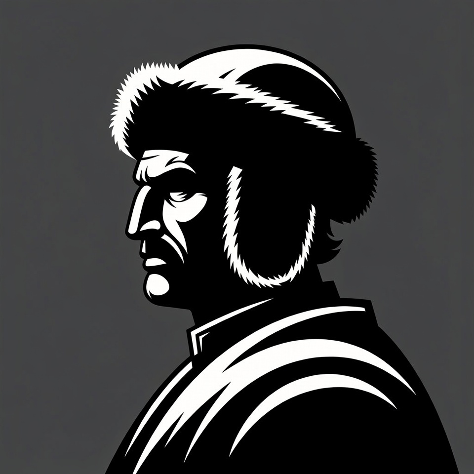 Black and white silhouette illustration of a man in profile view wearing a traditional fur ushanka hat with ear flaps. He has a stern expression and is dressed in a collared coat. The design features bold contrasts against a gray background.