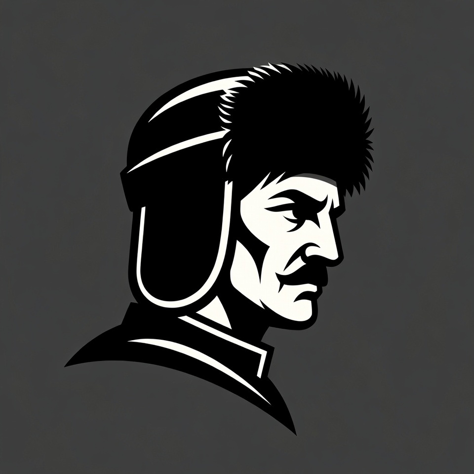Cossack, Russian hat, White, black and white, collar, ear flaps, fur hat, illustration, isolated background, logo style, male, military uniform, mustache, profile, side view, silhouette, stern expression, ushanka, vector art, man