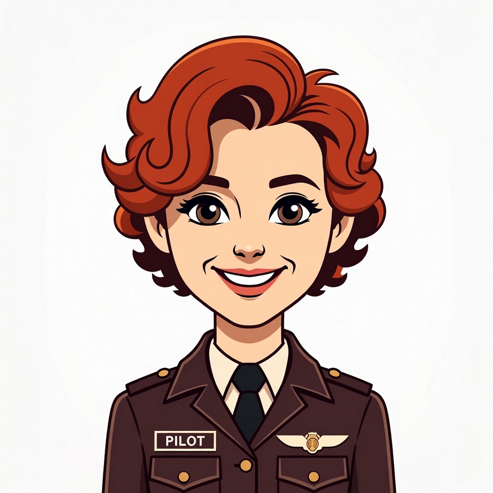 A cartoon illustration of a young woman with curly red hair smiling happily. She wears a brown military-style pilot uniform with a black tie, gold wings pin, and a name tag reading 'PILOT'. The figure is isolated on a white background.